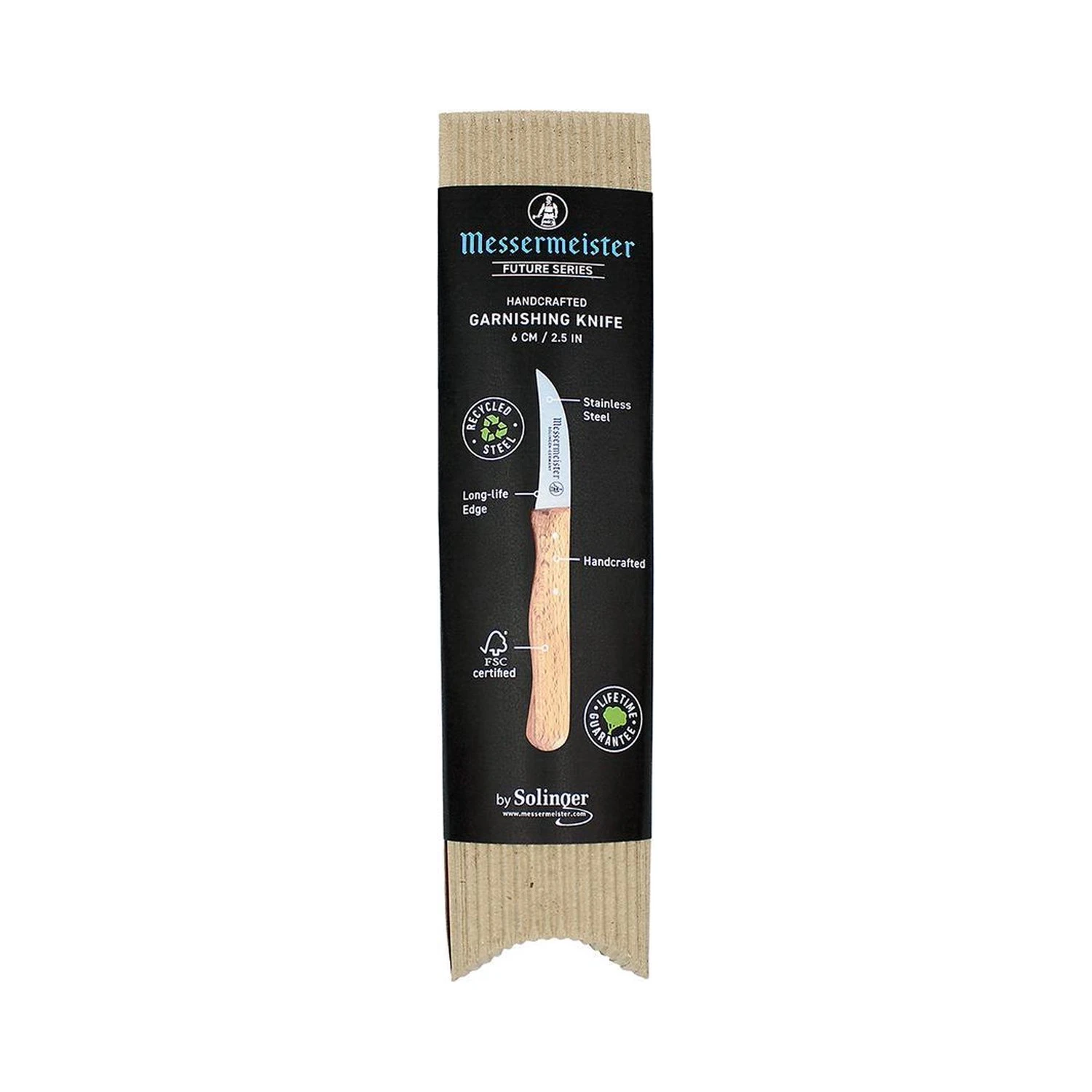 Dit Messermeister gebogen schilmesje heeft een lemmet van 6 cm en een handvat van duurzaam geproduceerd rood beukenhout. Het hout heeft de eigenschap dat ook als het nat is een goede grip te hebben. Het lemmet is van hoogwaardig RVS en gaat bij goed onderhoud meer dan een leven lang mee.